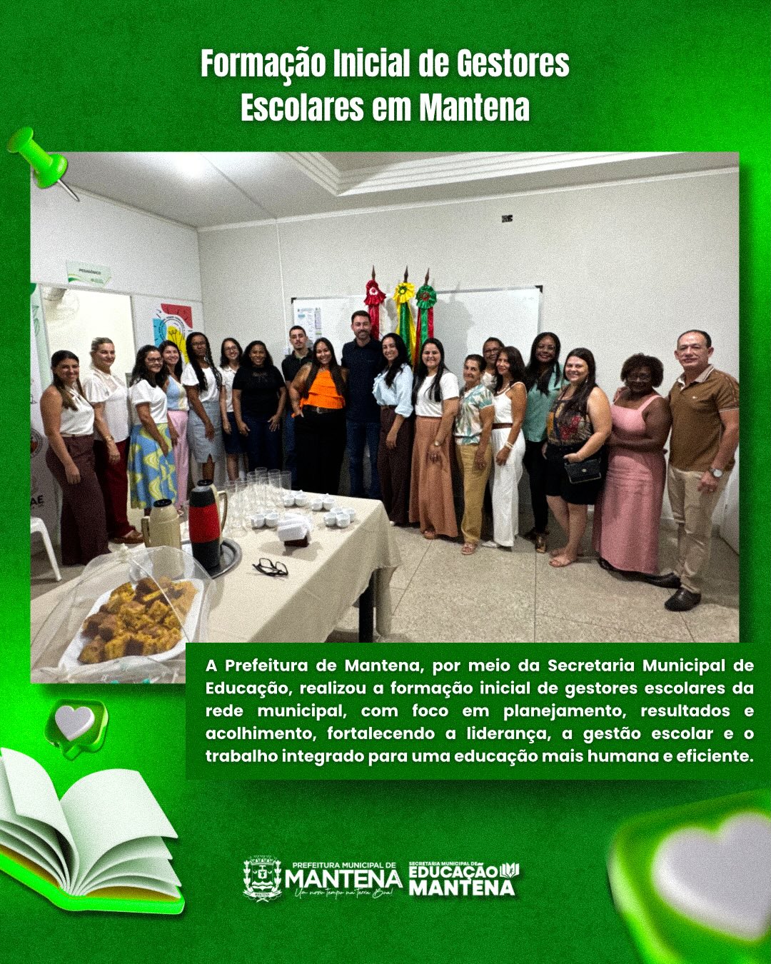 A Prefeitura de Mantena, por meio da Secretaria Municipal de Educação, realizou a Formação Inicial de Gestores Escolares da rede municipal, com o tema “Gestão Escolar com foco no planejamento, resultados e acolhimento”. O encontro reuniu diretoras das unidades escolares do município em um momento de aprendizado, troca de experiências e reflexões sobre liderança e gestão educacional.