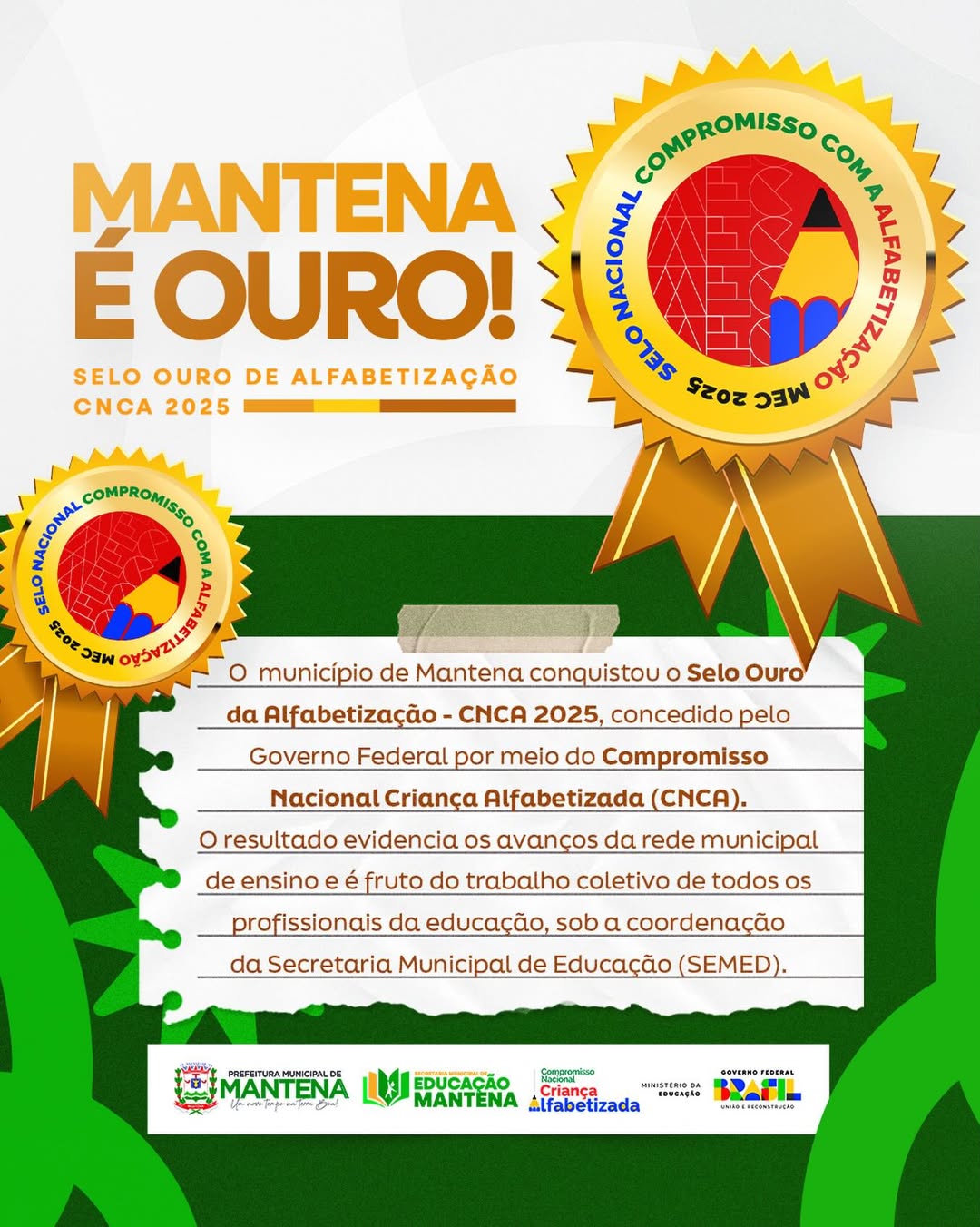 A Prefeitura Municipal de Mantena celebra um momento histórico para a educação do município. Após reanálise do Ministério da Educação, Mantena conquistou o Selo Ouro no Selo Nacional Compromisso com a Alfabetização – 2025, a mais alta certificação concedida aos municípios que atingem excelência nas metas de alfabetização.