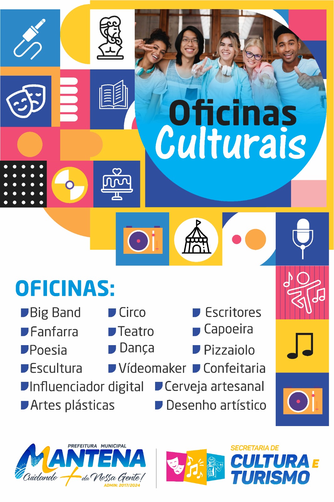 A Prefeitura de Mantena convida a todos para participarem das oficinas culturais e fortalecerem a cultura do nosso município!