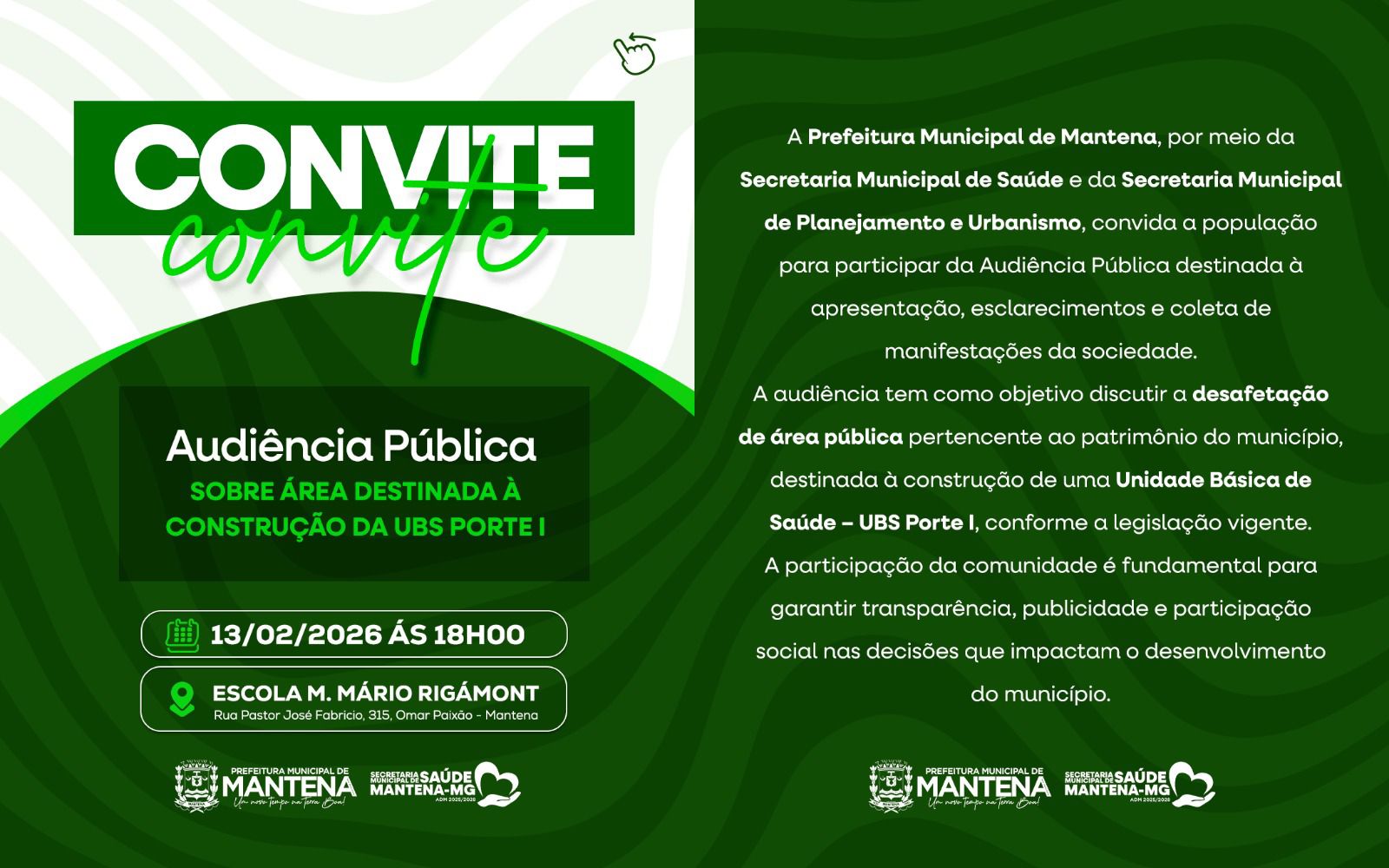 A Prefeitura Municipal de Mantena convida toda a comunidade de Mantena para participar da Audiência Pública sobre a área destinada à construção da UBS Porte I.