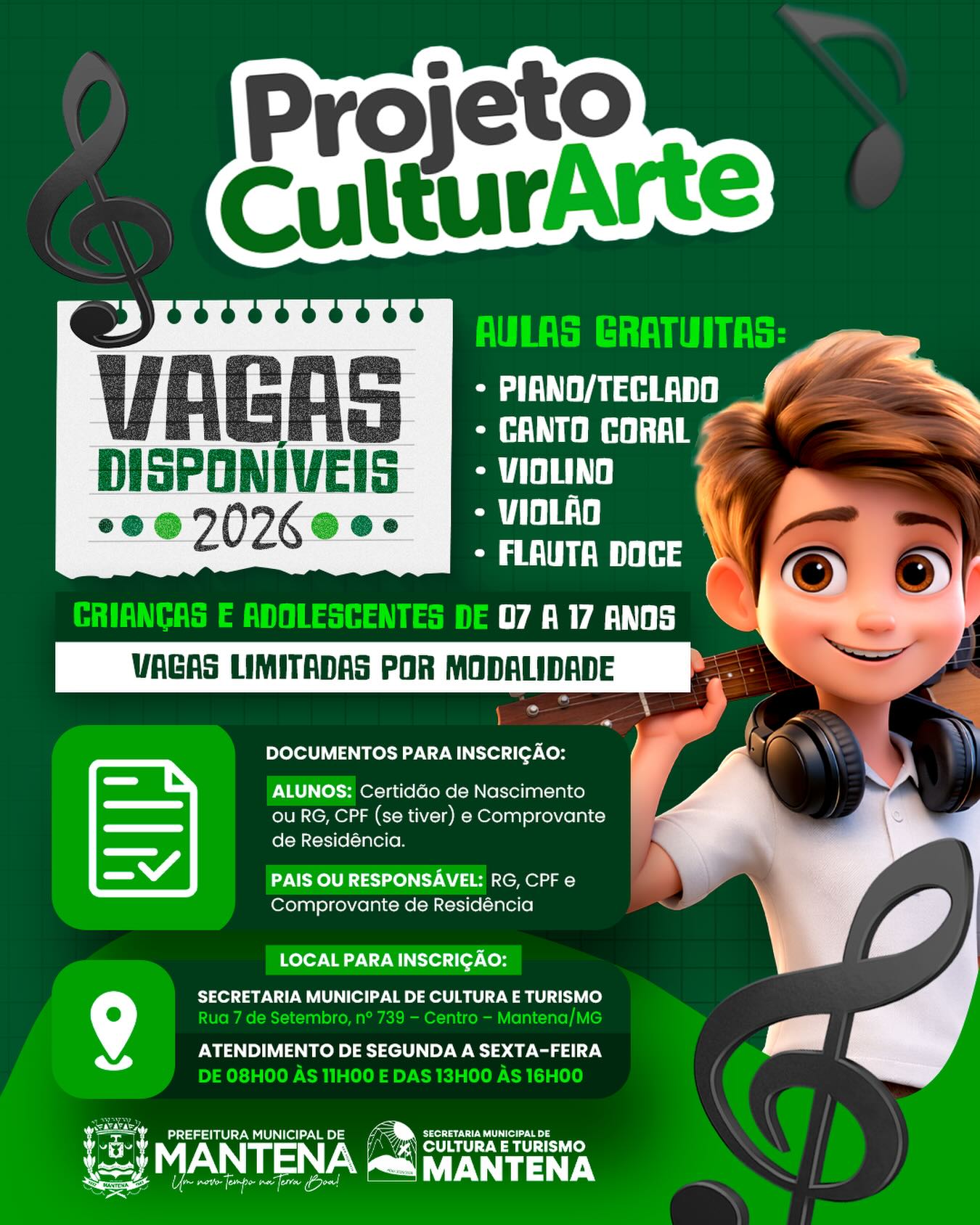 A Prefeitura Municipal de Mantena, por meio da Secretaria Municipal de Cultura e Turismo, informa que ainda há vagas abertas para o Projeto Culturarte 2026, iniciativa que oferece aulas gratuitas de música para crianças e adolescentes do município.
