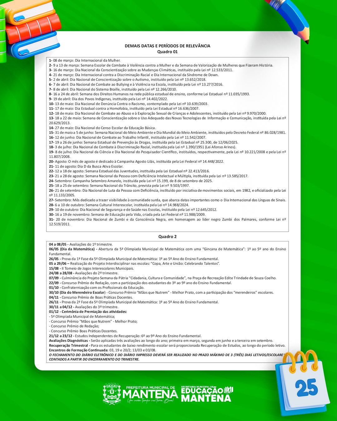A Prefeitura Municipal de Mantena, por meio da Secretaria Municipal de Educação (SEMED), torna público o Calendário Escolar 2026, elaborado em conformidade com as diretrizes legais e pedagógicas vigentes. O documento reafirma o compromisso da gestão municipal com um ano letivo organizado, seguro e de qualidade, voltado ao fortalecimento da aprendizagem e ao bom funcionamento da rede municipal de ensino.